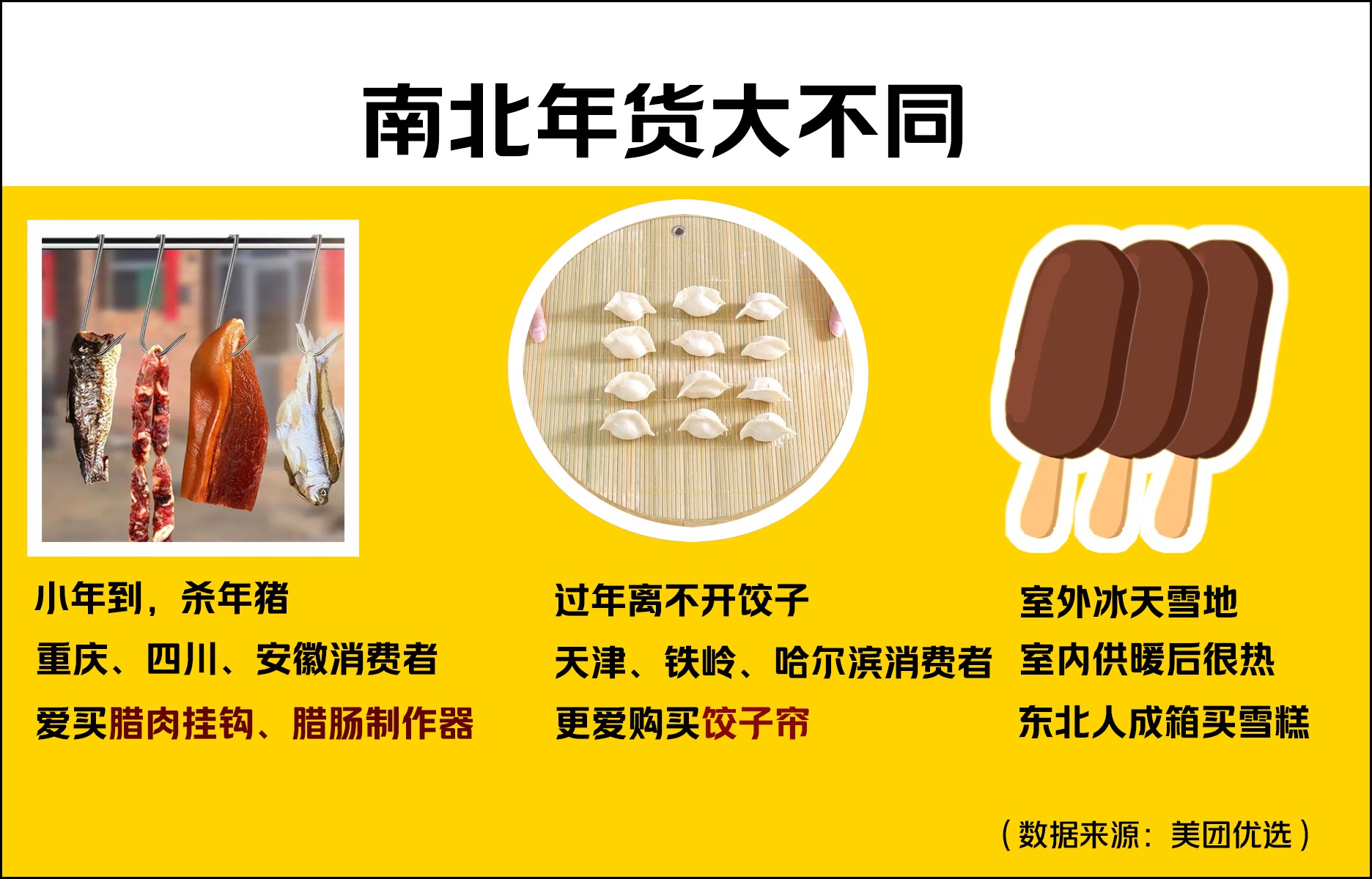 北方過(guò)年離不開餃子。美團(tuán)優(yōu)選數(shù)據(jù)顯示,餃子餡擠水袋、餃子簾、硅膠揉面墊、搟面杖等包餃子用具熱銷。其中,天津、鐵嶺、哈爾濱、唐山、沈陽(yáng)、濟(jì)南、承德、大連、滄州、廊坊消費(fèi)者更愛下單餃子簾,而愛下單搟面杖的消費(fèi)者多集中在東北三省。此外,東北因室內(nèi)供暖后足夠熱,雪糕成為招待親友、降溫解饞的熱選年貨。東北三省雪糕下單高峰從春節(jié)前三周就已開啟。