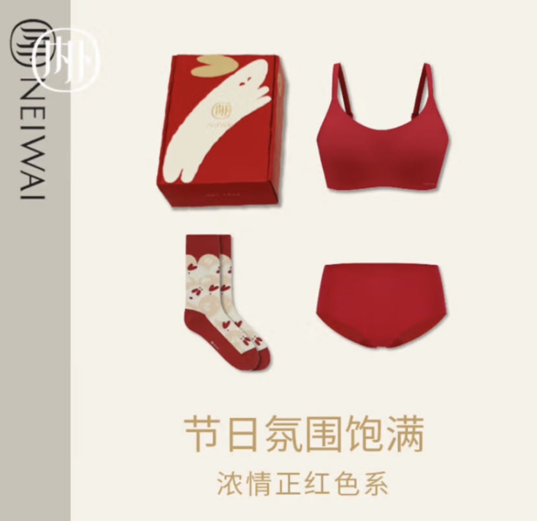 記憶中每到過年,家里人都會(huì)準(zhǔn)備一套紅色內(nèi)衣襪,希望來年紅紅火火。今年春節(jié),不妨就送親友一套NEIWAI內(nèi)外“錢兔似錦”紅色內(nèi)衣禮盒,包含正紅色內(nèi)衣套裝,以及印有“錢兔似錦”美好祝愿的兔年紅瓦。不但穿著舒適自在,還能帶來新年好意頭。