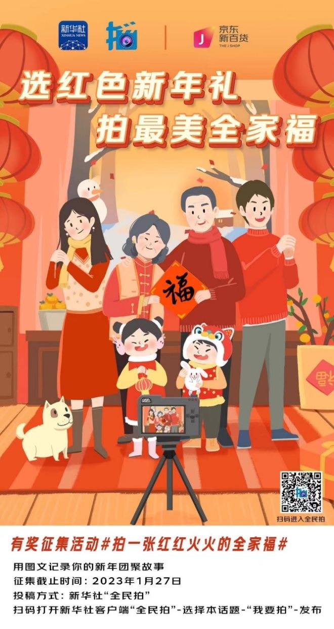 1月11日,京東新百貨將聯(lián)合新華社“全民拍”發(fā)起“拍一張紅紅火火的全家!被顒(dòng),全網(wǎng)征集春節(jié)期間拍攝的全家福照片,分享團(tuán)聚背后的溫情故事。參與活動(dòng)的用戶,只需進(jìn)入新華社客戶端“全民拍”話題頁面,選擇“拍一張紅紅火火的全家!痹掝},點(diǎn)擊“我要拍”選項(xiàng),并上傳一張全家福照片+一段描述照片故事的文字,即可參與征集活動(dòng)。