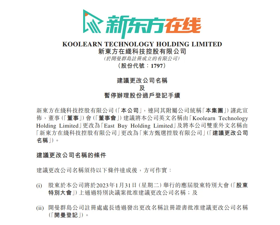 而為了完成全面轉(zhuǎn)型,在2023年1月5日,新東方旗下的新東方在線發(fā)布公告稱,董事會(huì)建議將本公司英文名稱由Koolearn Technology Holding Limited更改為East Buy Holding Limited及將本公司雙重外文名稱由新東方在線科技控股有限公司更改為東方甄選控股有限公司。