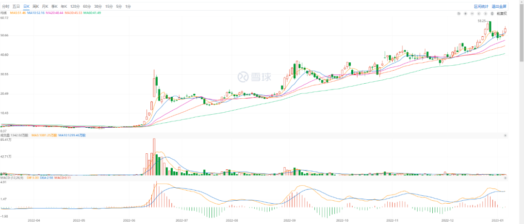 東方甄選的火熱也直接拉動(dòng)了二級(jí)市場(chǎng)的預(yù)期,新東方在線股價(jià)在2021年12月28日港股收盤價(jià)為7.21港元/股。但到去年12月28日,其股價(jià)攀升到52.65港元/股,一年上漲約630%。