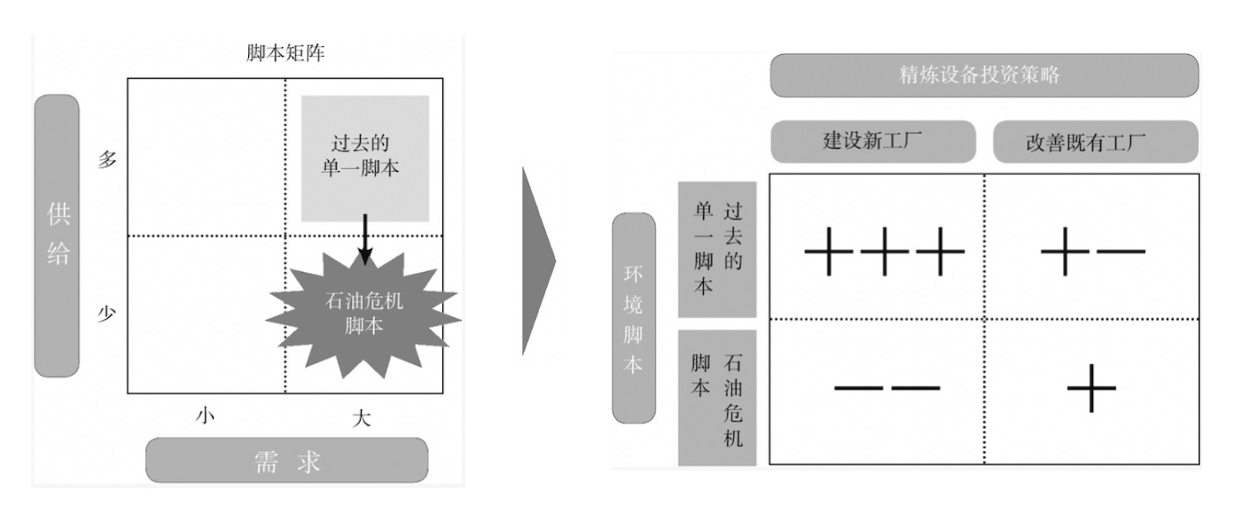 殼牌公司應(yīng)對(duì)石油危機(jī)可能爆發(fā)的預(yù)案是如何在“建設(shè)新工廠”,還是“改造即有工廠”中做出抉擇。石油產(chǎn)業(yè)鏈自上而下,可以分為上游的開(kāi)采投資比如挖掘原油的油井,和中游的投資石油的精煉設(shè)備比如建設(shè)石油化工廠,以及下游的石油產(chǎn)品的配送和銷售網(wǎng)絡(luò)比如設(shè)立加油站等。在危機(jī)情況下,敏感度最高的是中游的“開(kāi)設(shè)新工廠”還是“改善即有工廠”的抉擇。