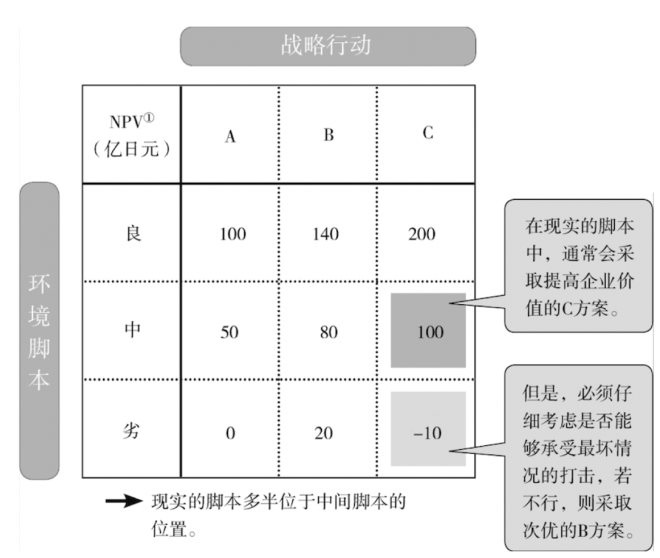 如圖2左所示,殼牌公司是唯一對(duì)石油危機(jī)的情境有預(yù)判的公司。而圖2右則是殼牌公司在景氣和危機(jī)情況下的投資策略分析?梢(jiàn),在石油危機(jī)的情況下,改善即有工廠的方案的優(yōu)勢(shì)得到了充分的體現(xiàn),隨著石油價(jià)格的高漲和石油供給的限制,追加在節(jié)約原油產(chǎn)業(yè)上游的投資的效果則會(huì)越發(fā)明顯,而這時(shí)候投資新工廠的回報(bào)率就很低了。殼牌公司正是因?yàn)橛辛诉@樣的預(yù)案才得以在石油危機(jī)時(shí)一枝獨(dú)秀。