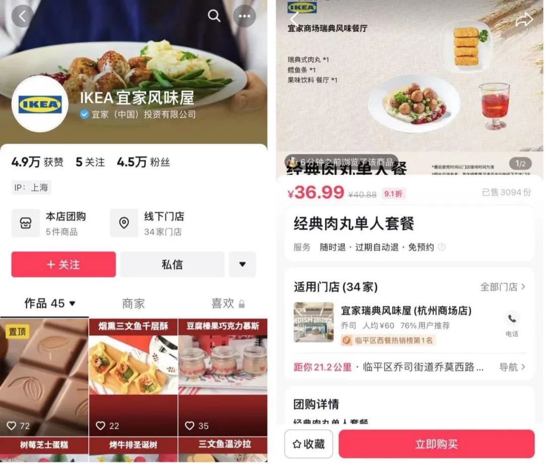今年7月,“IKEA宜家風味屋”的抖音賬號正式上線,該賬號的認證主體為(宜家)中國投資有限公司,發(fā)布的視頻以肉丸、牛排、松餅、各類蛋糕美食為主。IKEA宜家風味屋后續(xù)還嘗試了直播帶貨,銷量最高的是宜家瑞典風味餐廳的經典肉丸單人套餐,售價36.99元,目前已經邁出了3094份。