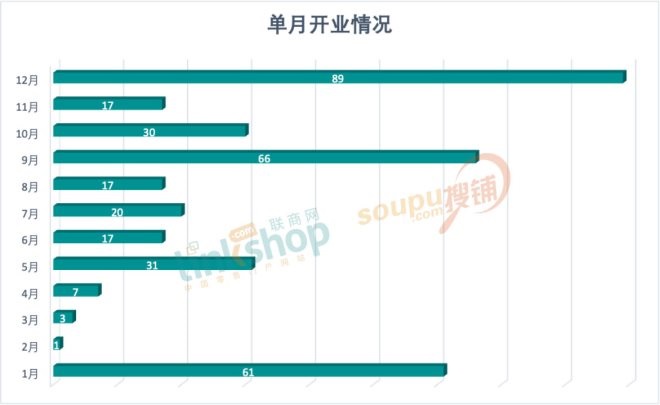 具體來看,12月最多,達到一年峰值為89個;其次是9月份,新開了66個項目;一月份得益于元旦檔和即將臨近的春節(jié)也有不少項目開業(yè),有61個;其他5月、10月也迎來了供應(yīng)小高峰;春節(jié)周期的二、三月份開業(yè)量最少,也是常態(tài)。