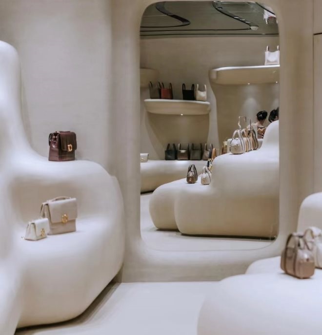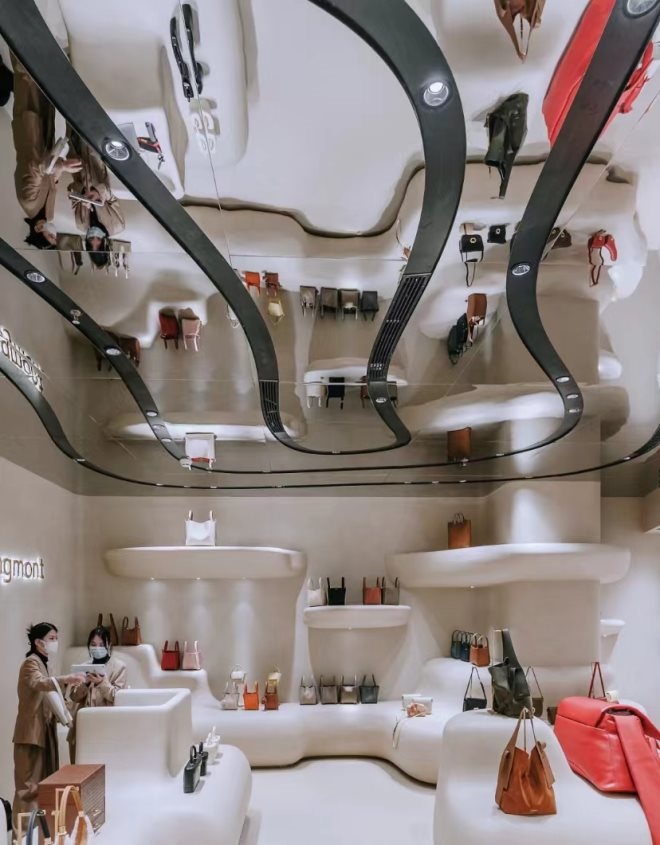 華南首店選擇象牙白為主色調(diào),如手工捏出的展臺擺放錯落有致,上方陳列著各色包包,非常具有藝術(shù)性,天花板的設(shè)計也非常特別,整塊天花板都是鏡子,幾條燈帶蜿蜒曲折,起到點綴的作用。