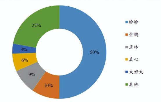 2018年洽洽在中國包裝瓜子領(lǐng)域已占據(jù)54%的市占率。隨著競爭者的快速入局,瓜子市場逐漸邁入成熟期,洽洽包裝流通瓜子的市場占比甚至開始減少。比起18年,2021年洽洽瓜子占據(jù)包裝流通瓜子約50%的市占份額。