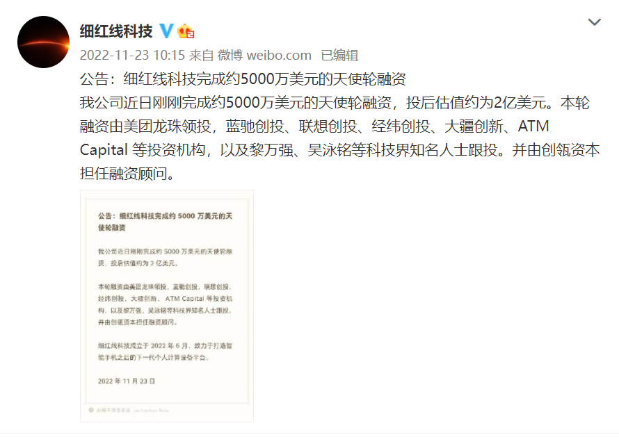 2022年11月,羅永浩成立的AR創(chuàng)業(yè)公司Thin Red Line通過(guò)官方微博微博正式官宣,已于近日完成約5000萬(wàn)美元的天使輪融資。由美團(tuán)龍珠領(lǐng)投,藍(lán)馳創(chuàng)投、聯(lián)想創(chuàng)投、經(jīng)緯創(chuàng)投、大疆創(chuàng)新、ATM Capital等投資機(jī)構(gòu),黎萬(wàn)強(qiáng)、吳泳銘等科技界大佬個(gè)人跟投。