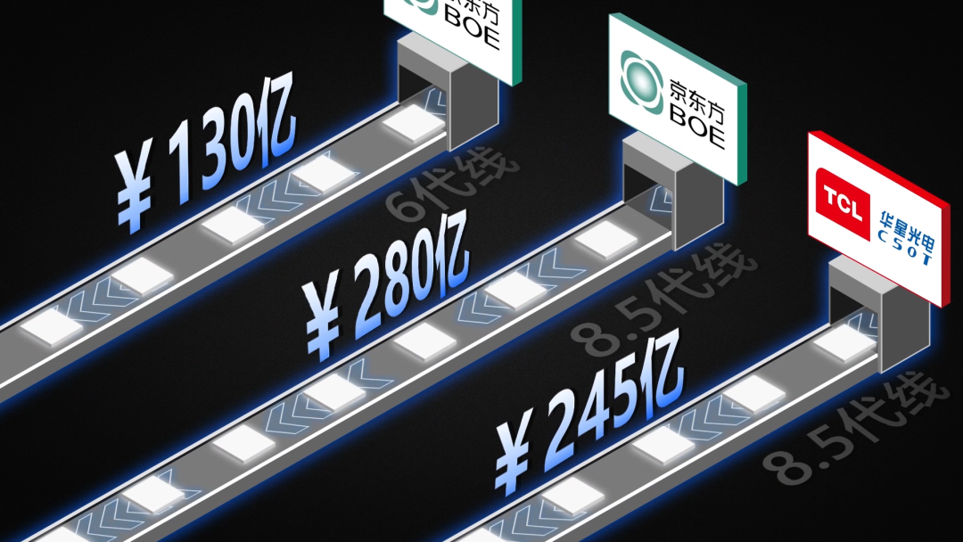 轉(zhuǎn)折發(fā)生在2009年,京東方和TCL華星依托于合肥、北京與深圳等地方在財(cái)政、土地等方面的支持,開始建設(shè)高世代6代線和8.5代線。其中京東方在合肥的6代線的投資總計(jì)130多億元,在北京的8.5代線投資總計(jì)280億元,而TCL華星在深圳的8.5代線總投資也達(dá)到了245億元。