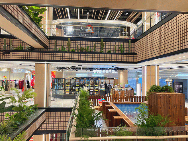 其次,印悅城突破固有扶梯體系,重新打造了兩個不同主題的場景中庭。南中庭新增網(wǎng)紅踏步樓梯以及花藝和咖啡,兼具休息和打卡功能;北中庭則將當(dāng)?shù)氐膽敉夥酱u建筑元素引入室內(nèi),同時種植大量熱帶植物,打造層疊錯落的綠色場景體驗,并引入寵物觀賞體驗區(qū)。南北雙中庭設(shè)計,既有觀賞區(qū)又有購物體驗區(qū),形成了南靜北動的商業(yè)格局,豐富了商場的空間開拓感和社交趣味性。