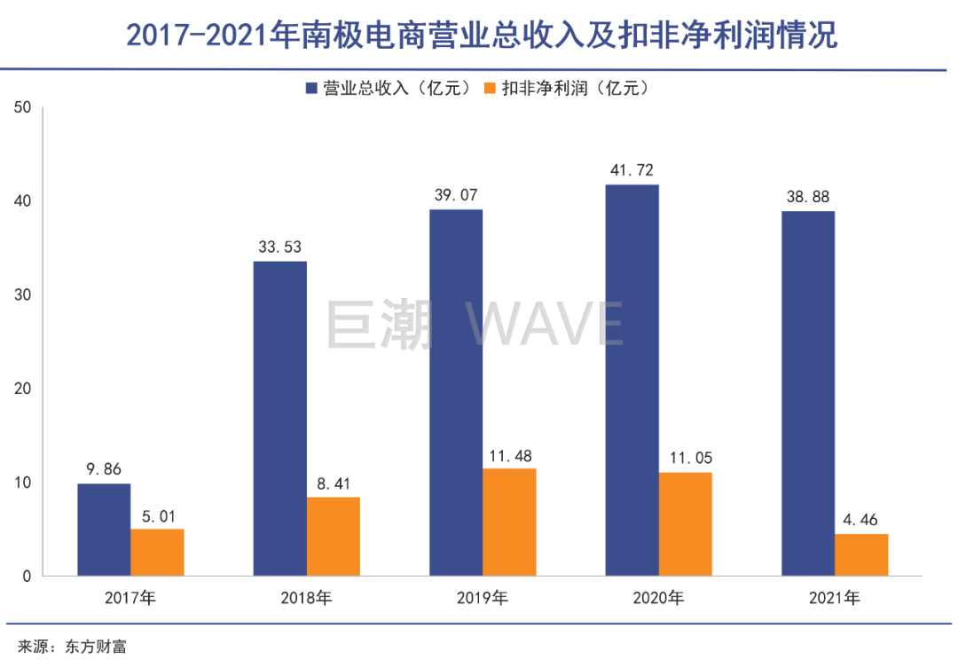 2017年時,南極電商更是以96.46%的毛利率成為了A股電商企業(yè)中王者一般的存在,因為這個毛利率竟然比茅臺還高,甚至被戲稱為“貼牌茅”。