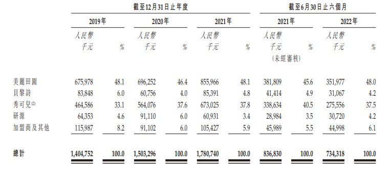 另一方面,據(jù)招股書顯示,美麗田園在傳統(tǒng)美容服務(wù)引入加盟店模式已超過(guò)15年。但從營(yíng)收水平來(lái)看,該板塊對(duì)公司的貢獻(xiàn)并不大。據(jù)招股書顯示,來(lái)自加盟店的收益貢獻(xiàn)則分別為8450萬(wàn)元、7090萬(wàn)元、8750萬(wàn)元和3580萬(wàn)元,分別占2019年-2022年上半年總營(yíng)收的6.0%、4.7%、4.9%及4.9%。