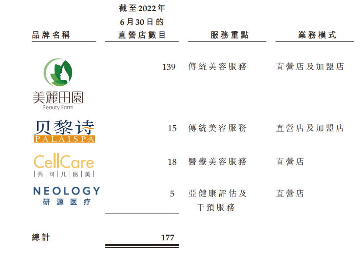 目前,美麗田園旗下?lián)碛忻利愄飯@品牌和其它3個(gè)品牌,即貝黎詩(shī)、研源及秀可兒。其中,美麗田園品牌和貝黎詩(shī)主要從事傳統(tǒng)美容服務(wù),業(yè)務(wù)模式以直營(yíng)和加盟為主;秀可兒主營(yíng)包含儀器護(hù)理和注射在內(nèi)的醫(yī)療美容服務(wù)、研源主要是亞健康評(píng)估及干預(yù)服務(wù),這兩個(gè)品牌則以直營(yíng)店為主。