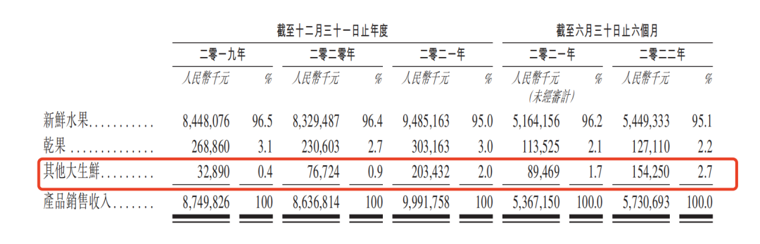 目前來看,尚且收效甚微。2019年~2021年,百果園大生鮮銷售收入分別為3289萬元、7672.4 萬元和 2.03 億元,占總收入的比重分別為0.38%、0.89% 和 2.04%。2022 年上半年,這一板塊錄得收入 1.54 億元,占總收入的比重提升至2.7%。