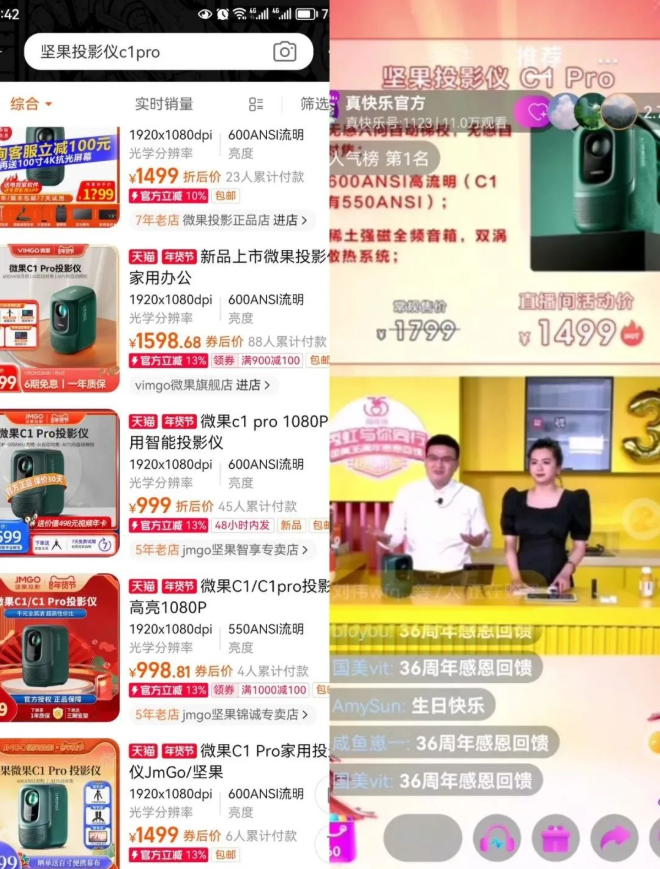 據(jù)悉,創(chuàng)維G22 65英寸4K全面屏電視機(jī)在京東同款商品的售價為3699元,而當(dāng)時直播間的價格為3199元。堅果投影儀C1 pro直播間的價格是1499元,這一價格和淘寶價格基本持平。