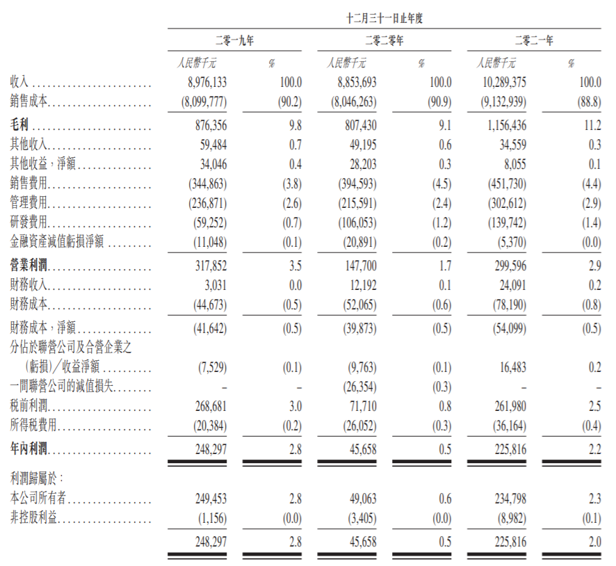 2019-2021年,百果園的毛利分別為8.76億元、8.07億元與11.56億元,毛利率分別為9.8%、9.1%及11.2%。同期,凈利潤(rùn)分別為2.49億元、0.49億元與2.35億元,凈利潤(rùn)率分別為2.8%、0.5%及2.2%,凈利率始終維持在2%-3%之間。
