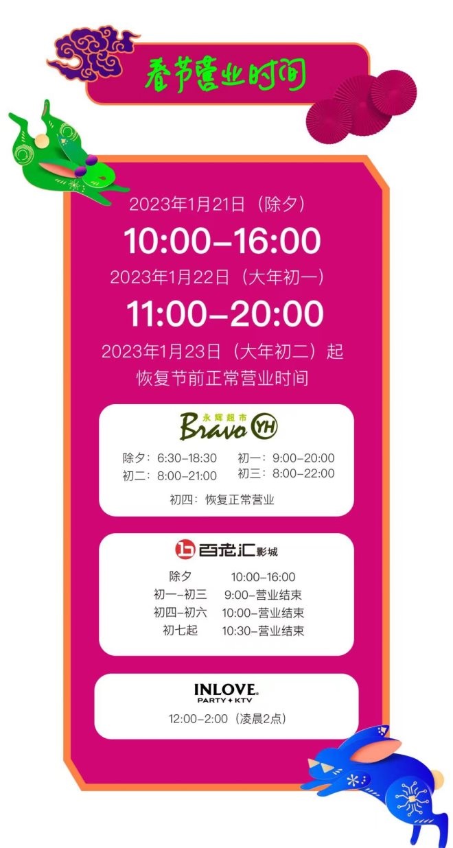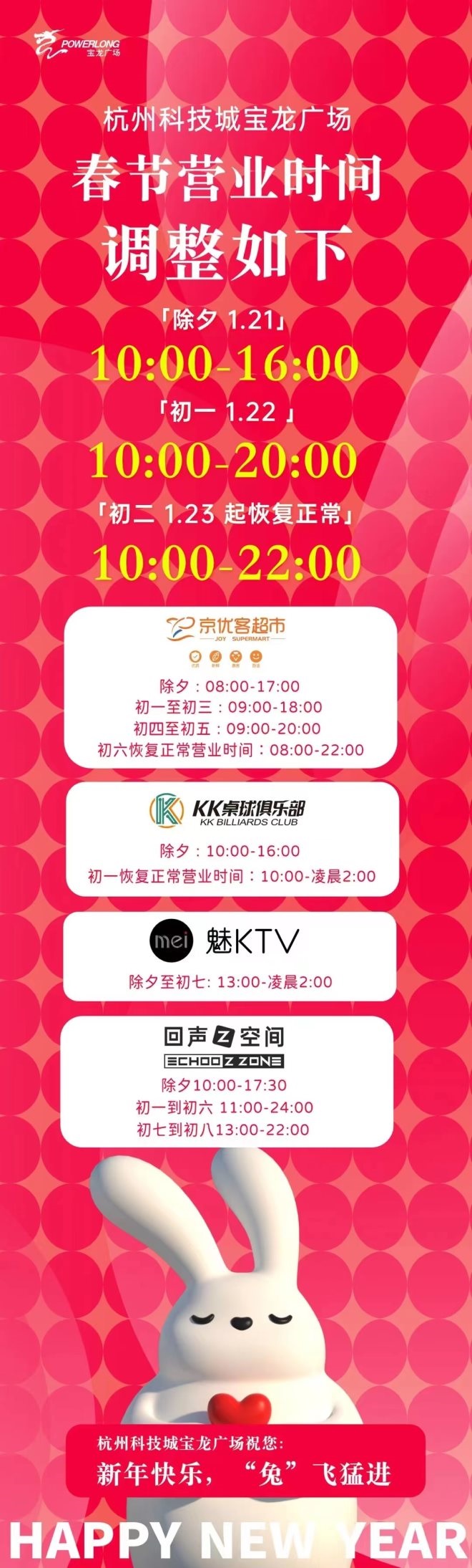 杭州科技城寶龍廣場:1月21日(除夕)10:00—16:00,1月22日(大年初一)10:00—20:00,1月23日(大年初二)起恢復(fù)正常營業(yè)時間。