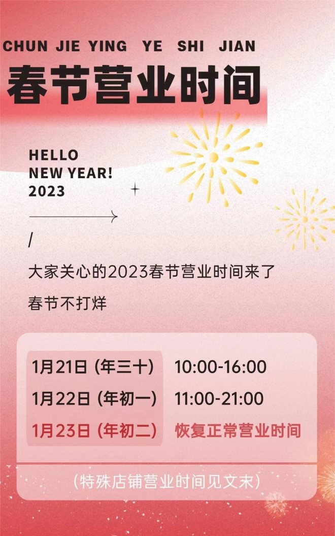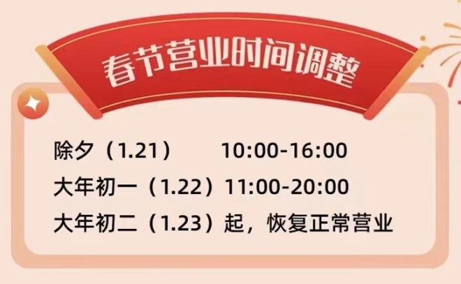 來福士:1月21日(除夕)10:00—16:00,1月22日(大年初一)11:00—20:00,1月23日(大年初二)11:00—21:00,1月24日(大年初三)起恢復(fù)正常營業(yè)時間。