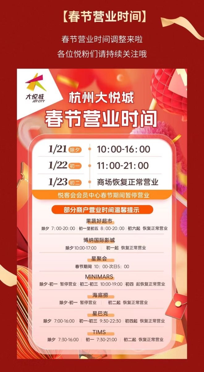 杭州大悅城:1月21日(除夕)10:00—16:00,1月22日(大年初一)11:00—21:00,1月23日(大年初二)起恢復(fù)正常營業(yè)時間。