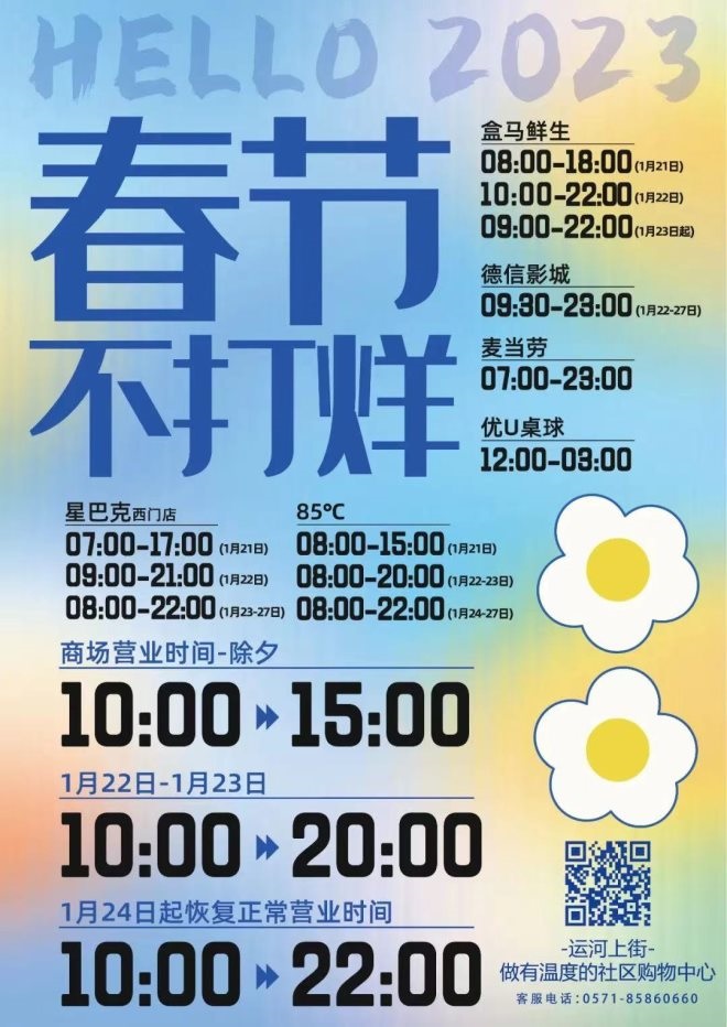 杭州運(yùn)河上街購物中心:1月21日(除夕)10:00—15:00,1月22日—23日(大年初一、大年初二)10:00—20:00,1月24日(大年初三)起恢復(fù)正常營業(yè)時間。