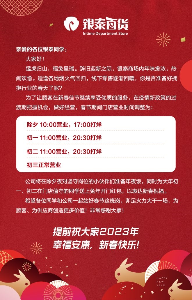 銀泰百貨所有門店:1月21日(除夕)10:00—17:00,1月22日—23日(大年初一、大年初二)11:00—20:30,1月24日(大年初三)起恢復(fù)正常營業(yè)時間。