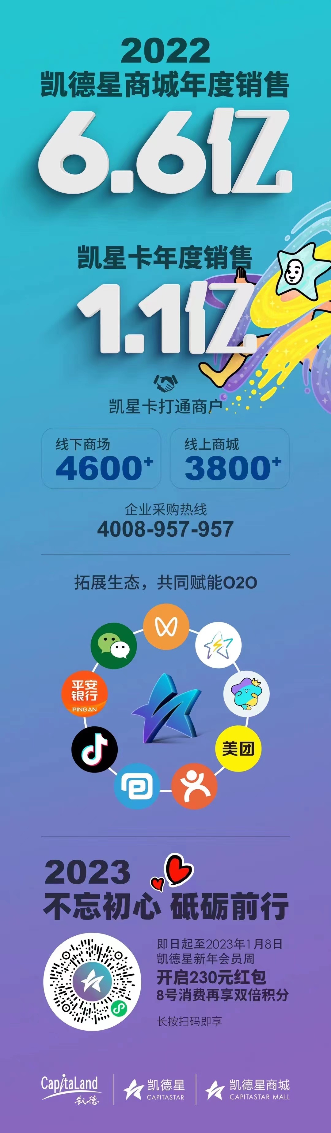 此外,凱德攜手永璞咖啡推出聯(lián)名版凱星卡,購卡即送的啡常凱心“富鱷袋”周邊產(chǎn)品也異常吸睛,不僅引發(fā)消費者紛紛打卡曬照,也實現(xiàn)了線上銷售到線下消費的完整閉環(huán)。凱星卡作為凱德2022年正式推出的線上線下一站式商業(yè)預(yù)付卡,年度銷售達(dá)1.1億元,打通了凱德線下商場4,600+商戶和線上商城3,800+商戶。