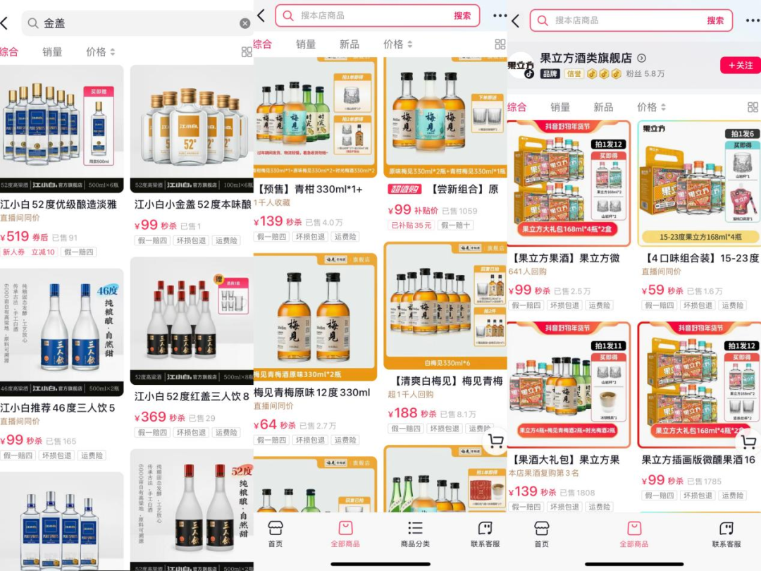 在京東電商平臺上搜索“江小白金蓋”,銷量最高的是官方旗艦店,但是評論只有1000+;淘寶電商平臺上,官方旗艦店的月銷量數(shù)據(jù)也是不太好看;抖音江小白旗艦店,金蓋銷量只有兩位數(shù)。