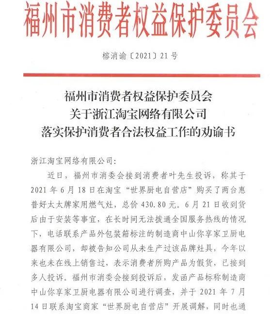 更早一些時候,接到投訴的福州市消委會調(diào)查發(fā)現(xiàn),消費者在淘寶上買的“惠普好太太”牌燃氣灶竟然是假冒產(chǎn)品。在對淘寶未積極處置假冒燃氣灶的行為發(fā)出下架勸諭函后,很長一段時間依然在正常銷售。