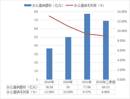 據(jù)媒體公開報道,2021年,得力的政企采購業(yè)務(wù)就已突破100億。這些都導(dǎo)致,晨光科力普無法通過提價提升毛利率。2022年前三季度,晨光辦公直銷產(chǎn)品的毛利率僅8.98%,排在主要產(chǎn)品的末位。