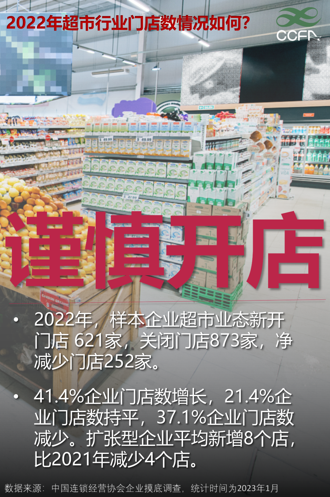 2022年,樣本企業(yè)超市業(yè)態(tài)新開門店621家,關(guān)閉門店873家,凈減少門店252家。