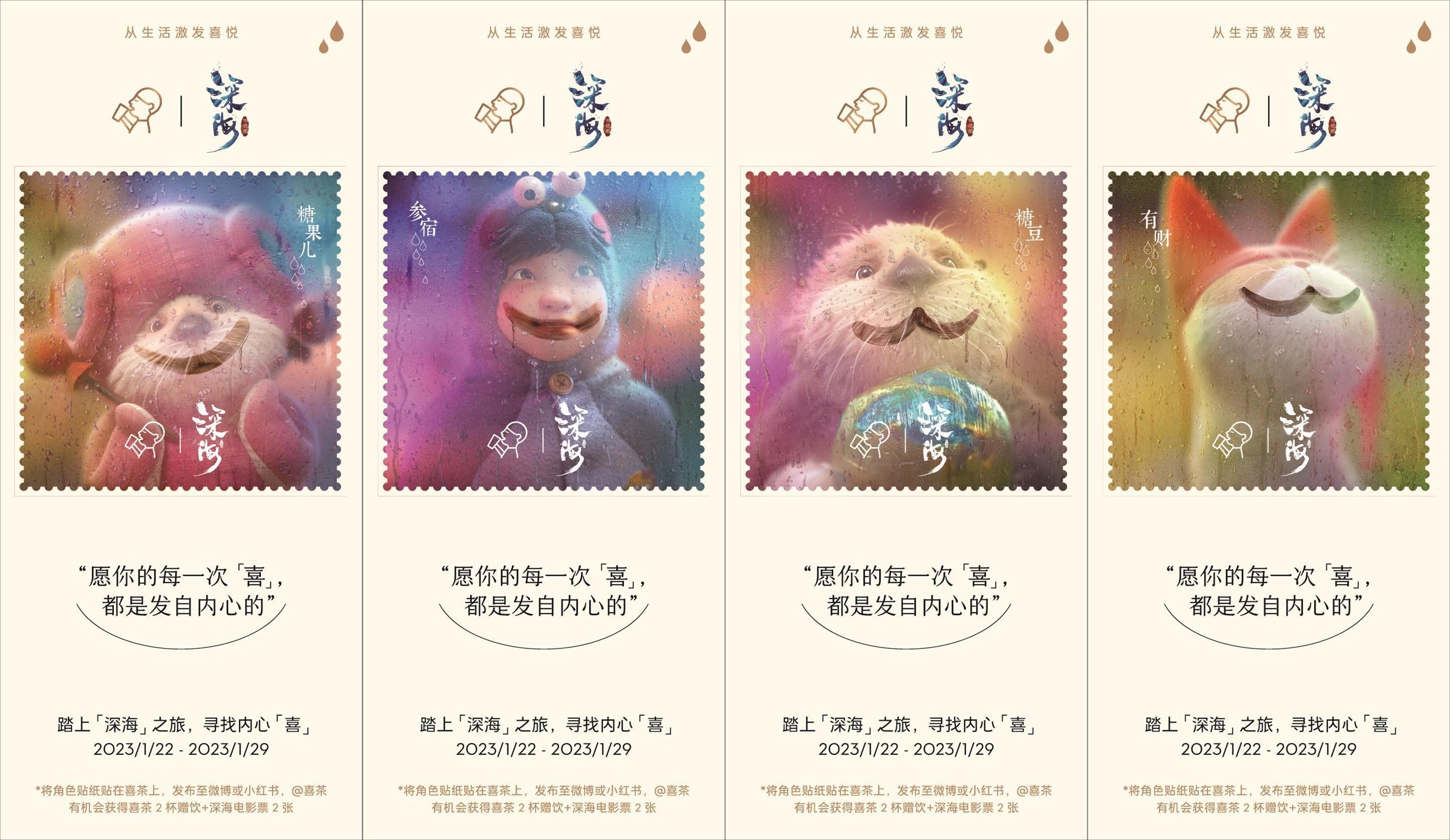 1月22日到1月23日,消費者購買喜茶,就能隨杯獲贈“聯(lián)動限定貼紙”。為了讓消費者在春節(jié)感受到更多喜悅,喜茶從《深海》的諸多角色形象中選擇了4款治愈系微笑的形象,以電影票根為靈感設計了系列聯(lián)動限定貼紙。