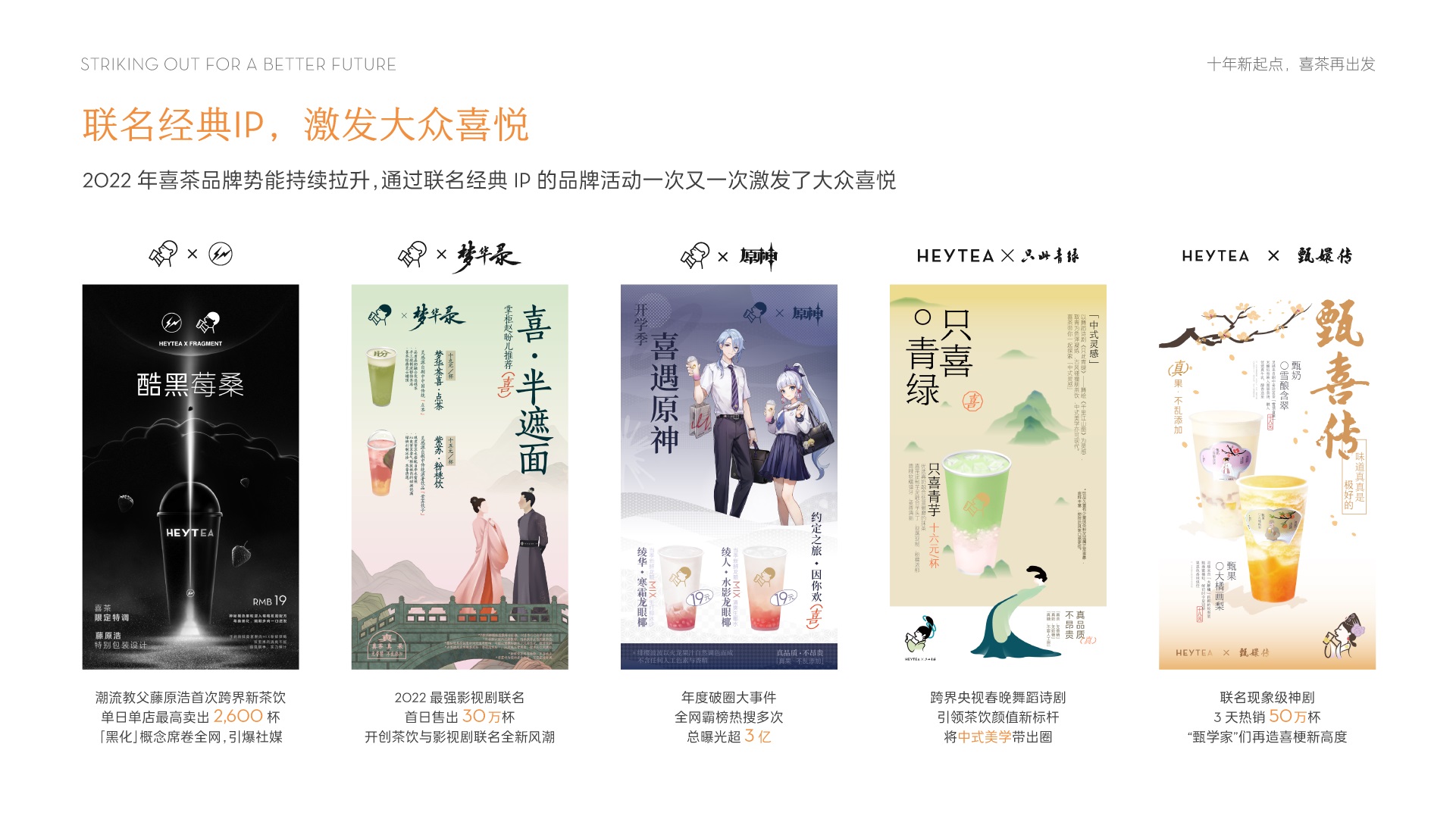 此前發(fā)布的《喜茶這十年》報告顯示,在剛剛過去的2022年,喜茶與藤原浩、夢華錄、原神、只此青綠、甄嬛傳等經典IP展開的品牌聯(lián)名活動都深受消費者喜愛。