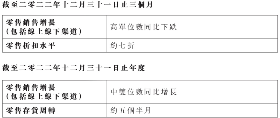 所有其他品牌產品的零售金額與2021年同期相比取得10%-20%的增長。