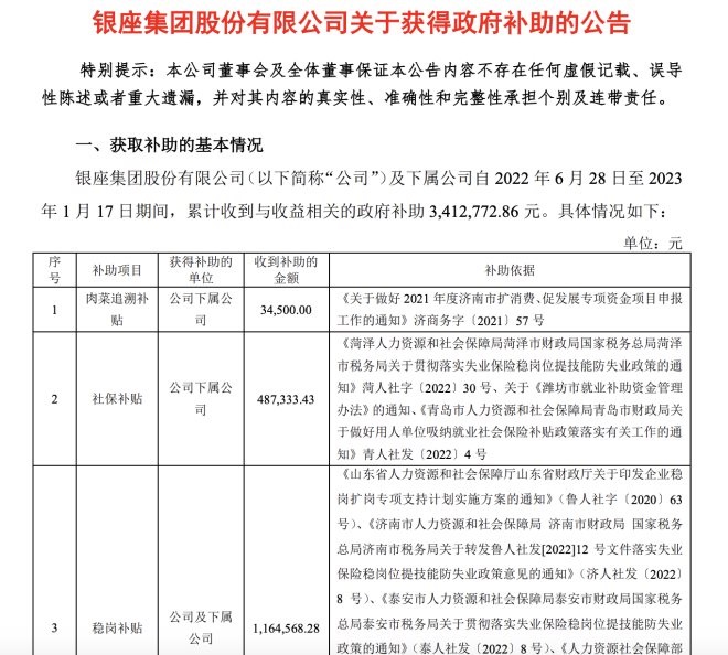 公告顯示,銀座股份及下屬公司自2022年6月28日至2023年1月17日期間,累計(jì)收到與收益相關(guān)的政府補(bǔ)助3,412,772.86元,主要包括社保補(bǔ)貼、穩(wěn)崗補(bǔ)貼、資金扶持、供電補(bǔ)貼、稅收減免及手續(xù)費(fèi)等。