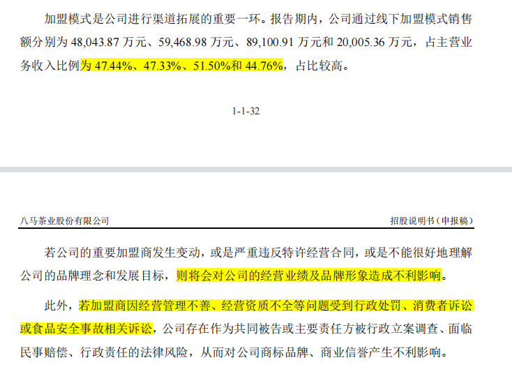 對(duì)此,八馬茶業(yè)也在招股書(shū)中坦言,占比較高的加盟商也將會(huì)是風(fēng)險(xiǎn)之一,其中因加盟商管理不善或者經(jīng)營(yíng)資質(zhì)不全導(dǎo)致的消費(fèi)者訴訟或食品安全事故,將會(huì)對(duì)公司品牌、商業(yè)信譽(yù)產(chǎn)生不利影響。