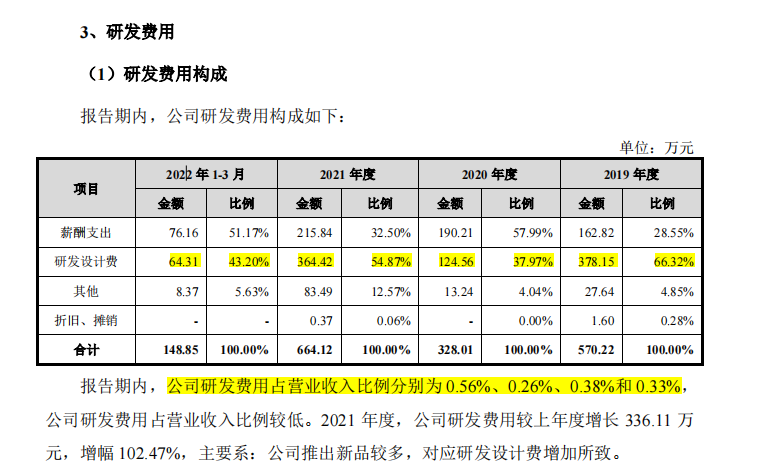從2019年到2022年第一季度,八馬茶業(yè)研發(fā)投入分別為570.22萬(wàn)元、328.01萬(wàn)元、664.12萬(wàn)元以及148.85萬(wàn)元,占當(dāng)期營(yíng)收比例分別為0.56%、0.26%、0.38%和0.33%。