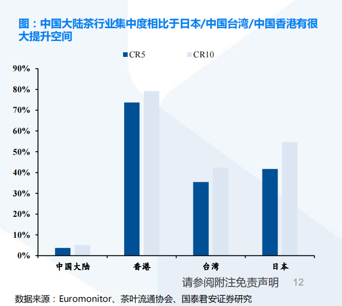 在我國(guó)千億級(jí)的茶葉市場(chǎng)中,規(guī)模雖大但是品牌集中度相當(dāng)?shù),遠(yuǎn)低于日本、中國(guó)香港等同期水平,競(jìng)爭(zhēng)格局相當(dāng)分散。