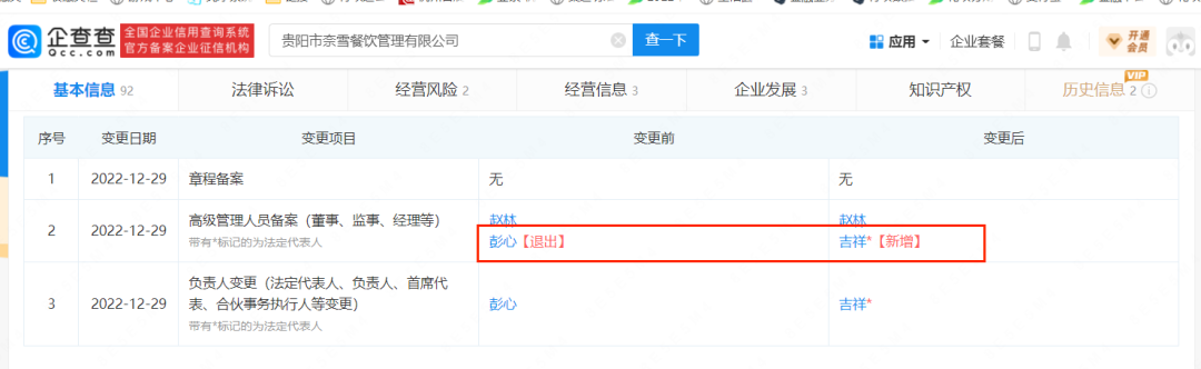 2022年12月29日,貴陽市奈雪餐飲管理有限公司的法人代表由彭心變更為吉祥;