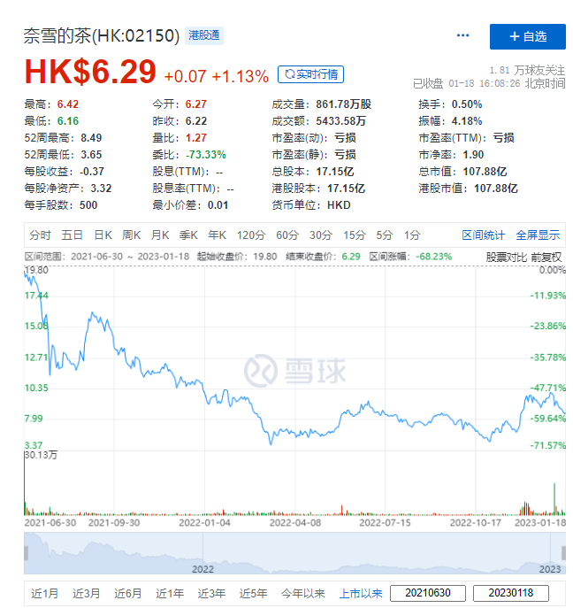 截至1月18日收盤,奈雪的茶最新股價(jià)為6.29港元每股,相較于19.8港元每股的發(fā)行價(jià)已經(jīng)跌去68.2%。