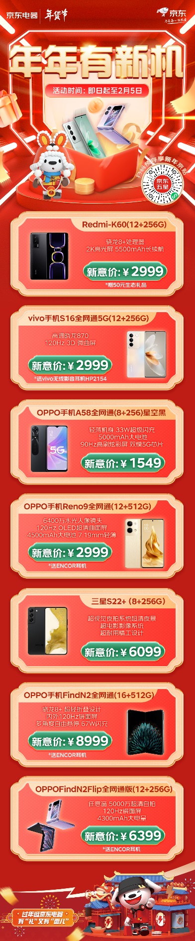 “年年有新機(jī)”活動推出的爆款直降清單囊括了:Redmi-K60(12+256G)新意價2999元,購機(jī)就贈50元生態(tài)禮品;vivo S16全網(wǎng)通5G(12+256G)年貨價2999元,并加送vivo無線影音耳機(jī)HP2154;具有內(nèi)外120Hz鏡面屏的折疊手機(jī)OPPO FindN2全網(wǎng)通(16+512G),新意價8999元;擁有33W超級閃充的OPPO A58全網(wǎng)通(8+256)星空黑活動價1549元;具有超視覺夜拍系統(tǒng)的三星S22+(8+256G)優(yōu)惠價6099元……新年買一件自己心儀潮電好物,為新年添一分快樂。
