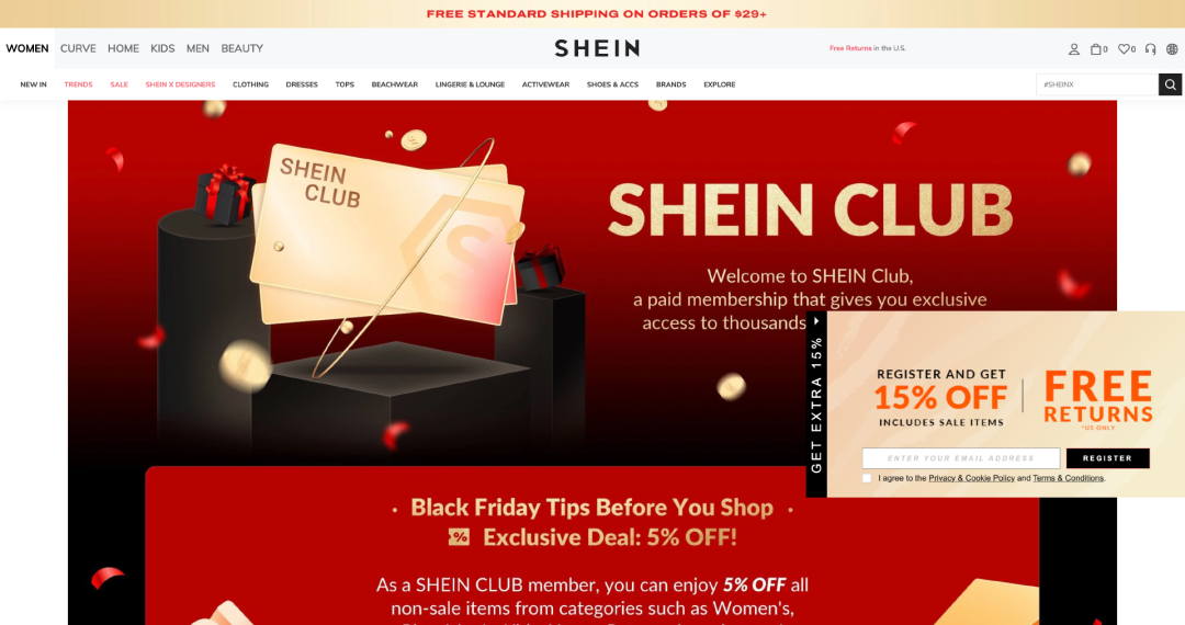 2022年10月2日,搜索引擎爬蟲(chóng)收錄了一個(gè)新網(wǎng)址,這是SHEIN最新推出的會(huì)員訂閱制服務(wù)“SHEIN Club”的入口。點(diǎn)開(kāi)SHEIN Club官網(wǎng)的一瞬間,充滿誘惑的配色就開(kāi)始刺激用戶眼球,巨大的15%折扣券、退貨免運(yùn)費(fèi)的廣告漂浮在屏幕右側(cè)。