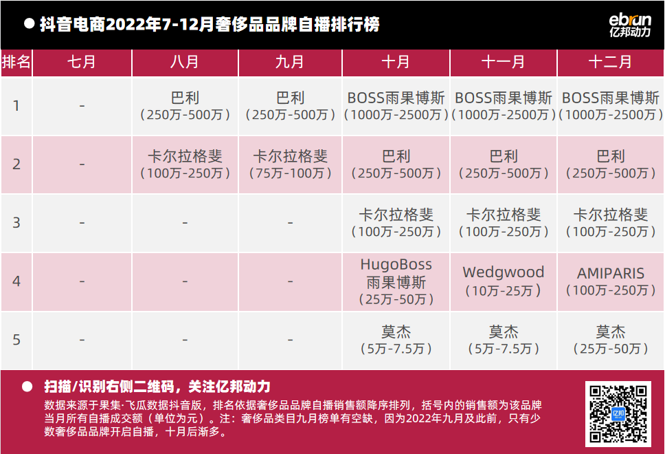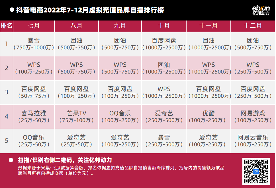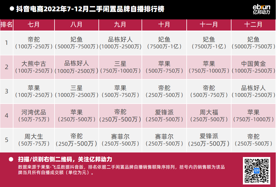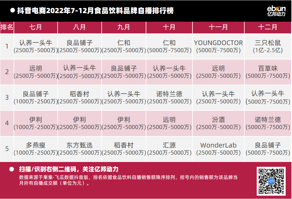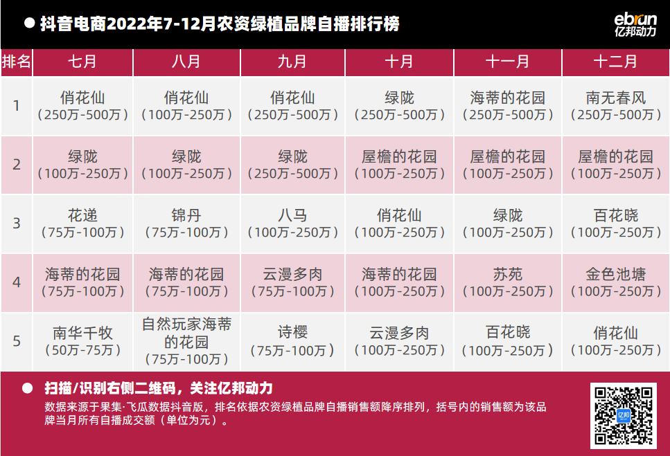 億邦動力根據(jù)“飛瓜數(shù)據(jù)(果集·飛瓜數(shù)據(jù)抖音版)”提供的數(shù)據(jù),盤點2022年7月-12月抖音自播總榜及20個垂直類目的榜單情況(按抖音銷售額進行排名)發(fā)現(xiàn):