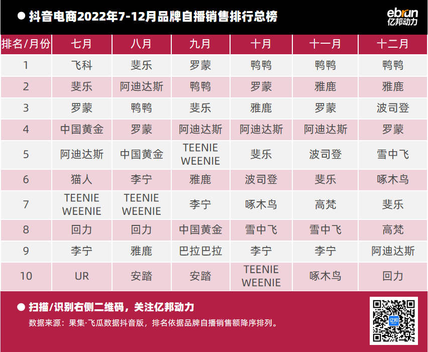 在抖音自播總榜里,阿迪達斯、斐樂連續(xù)6個月上榜,羅蒙連續(xù)6個月霸榜,鴨鴨和雅鹿連續(xù)上榜5次,中國黃金上榜3次,回力沖榜3次,飛科、貓人、巴拉巴拉等也進入過總榜,且部分品牌沖到靠前位置。