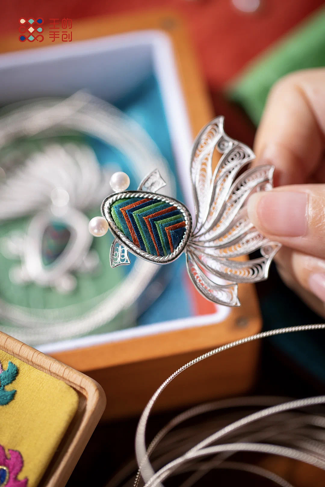 魚燈中使用竹制骨架,是大王結(jié)合傳統(tǒng)手藝的另一項(xiàng)嘗試,今年大王與國(guó)家非遺道安銀花絲傳承人合作,兩家聯(lián)合設(shè)計(jì)的胸針,做工精美,外形美觀大方,“也沒(méi)有丟了‘王的手創(chuàng)’的風(fēng)格”。