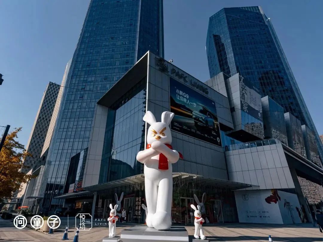 2023年剛開(kāi)年,“問(wèn)童子”就與平安悅坊合作,在廣場(chǎng)上展陳了一只10米高的巨型奮斗兔,兔子雙手抱拳,像是拜年的作揖,又像是摩拳擦掌,配合腳步霍霍向前,像極了新年要大干一場(chǎng)的模樣。