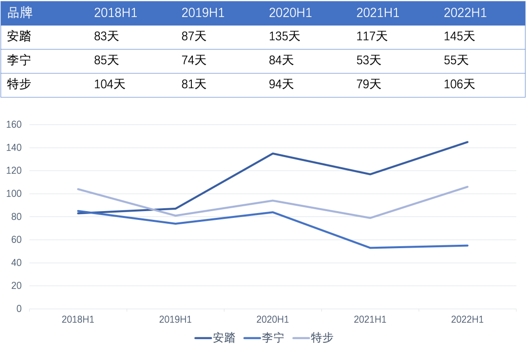 從安踏集團2022年的半年報看,其庫存周轉天數已達到145天,為近年來最高。同期相比,李寧的庫存周轉天數為55天,耐克為109天。