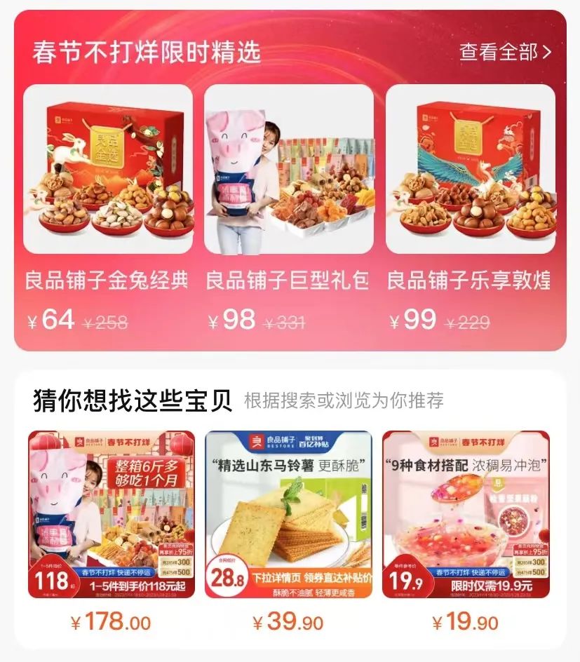 良品鋪?zhàn)觿t加入了淘寶的“春節(jié)不打烊”活動(dòng),給出了大力度優(yōu)惠。原價(jià)258元、331元、229元的禮包,折后需要64元、98元、99元。