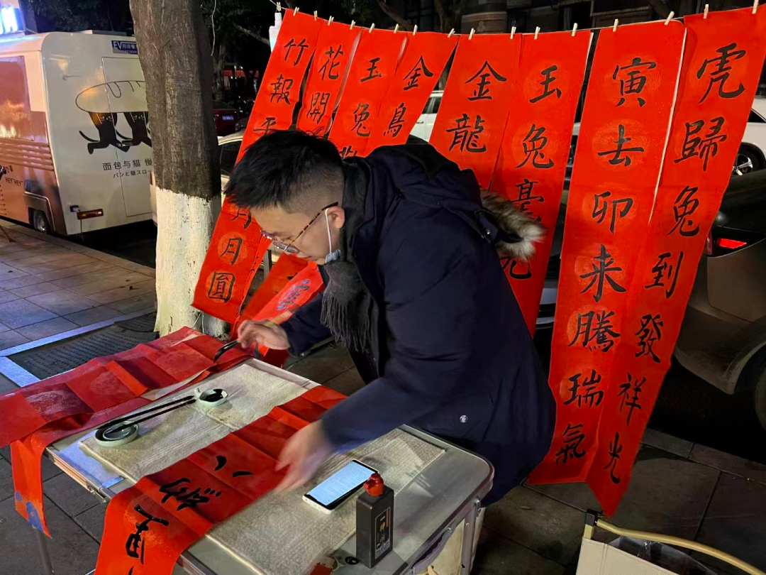 一晚上下來,牧哥總共賣了三十多副對聯(lián),再加上賣出的零散的福字、書簽和貼紙,收入超過了1000元,遠(yuǎn)遠(yuǎn)超出預(yù)期。