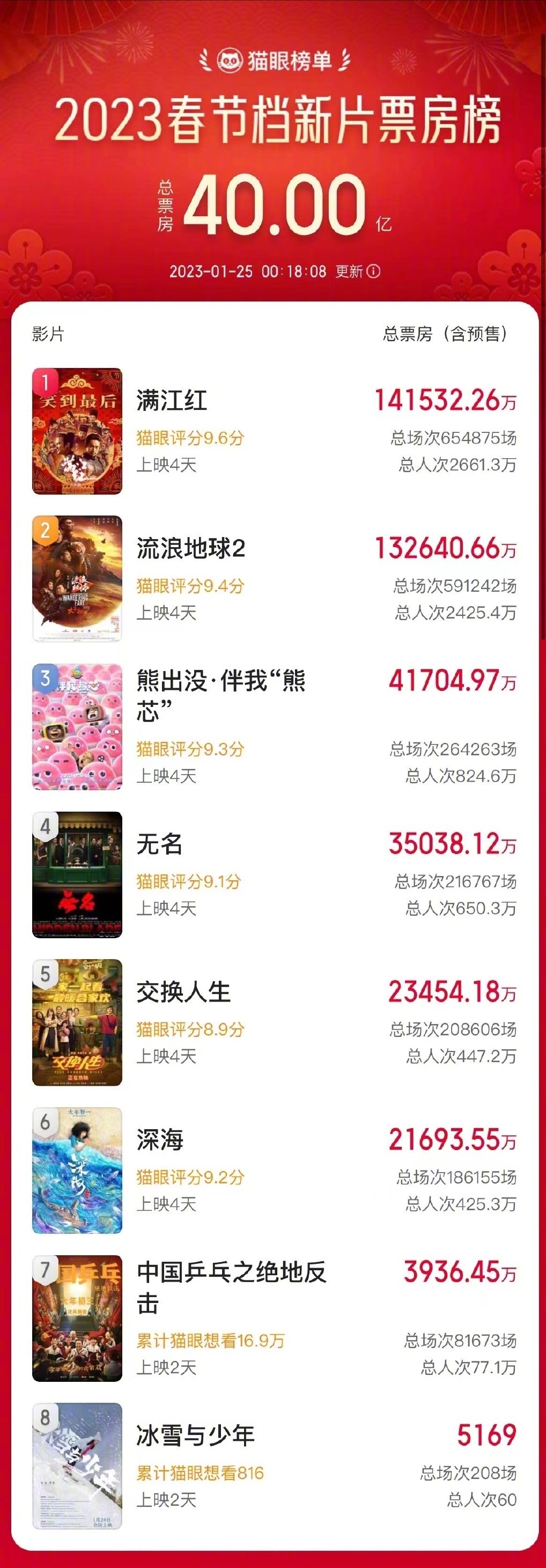 聯(lián)商快訊:據(jù)貓眼專業(yè)版數(shù)據(jù),截至1月25日0時18分,2023年春節(jié)檔新片總票房破40億。