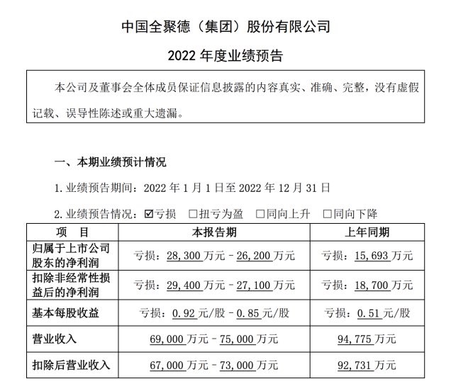 公告顯示,全聚德預(yù)計(jì)2022年度營(yíng)收為6.9億元-7.5億元,同比下降20.86%-27.20%;歸屬上市公司股東的凈虧損為2.62億元-2.83億元,虧損同比擴(kuò)大;扣除非經(jīng)常性損益后的凈虧損為2.71億元-2.94億元,與上一年度相比,扣非凈虧損也同樣擴(kuò)大。